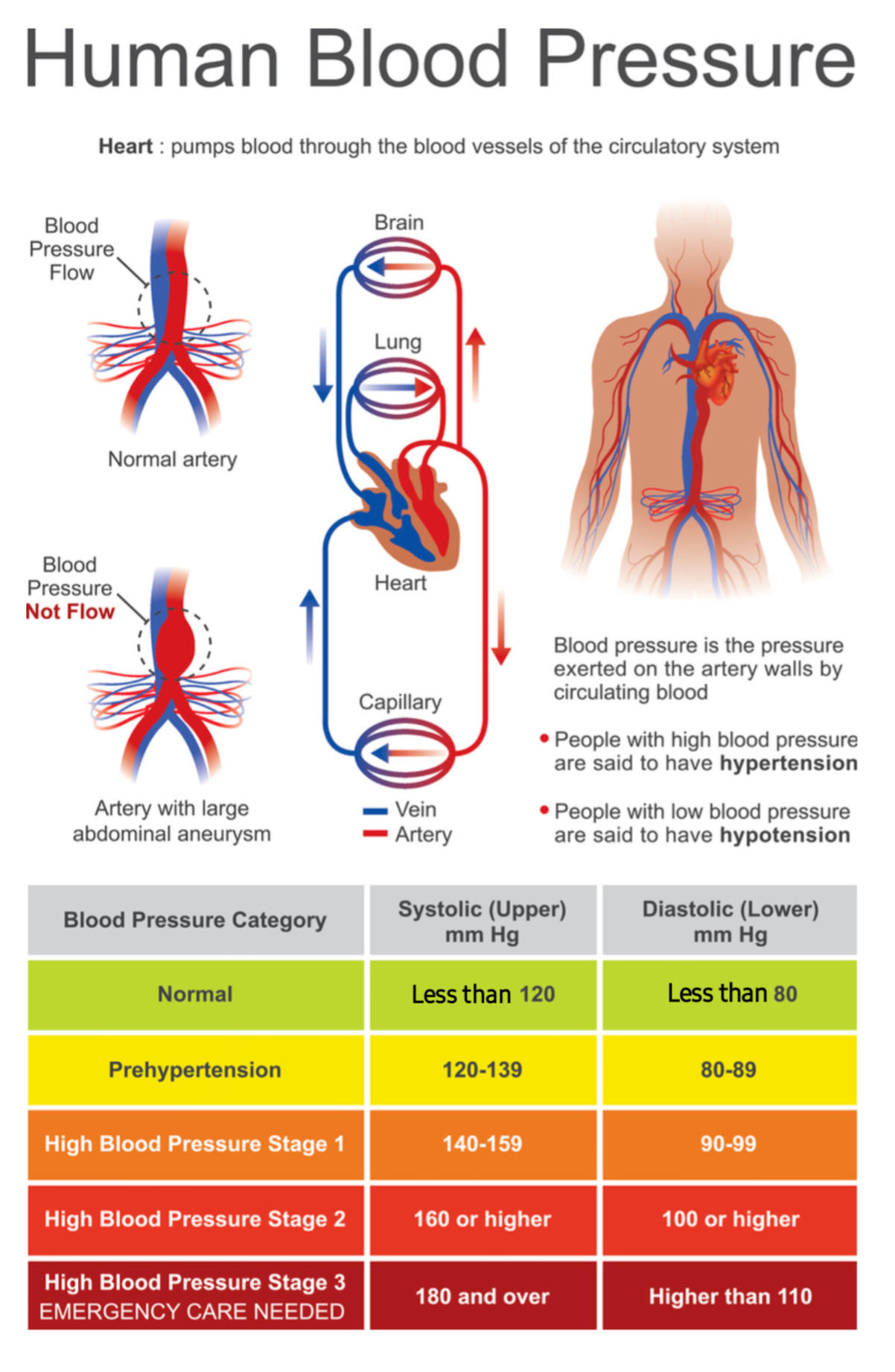 - Normal blood pressure – Systolic <120 mmHg and diastolic <80 mmHg.