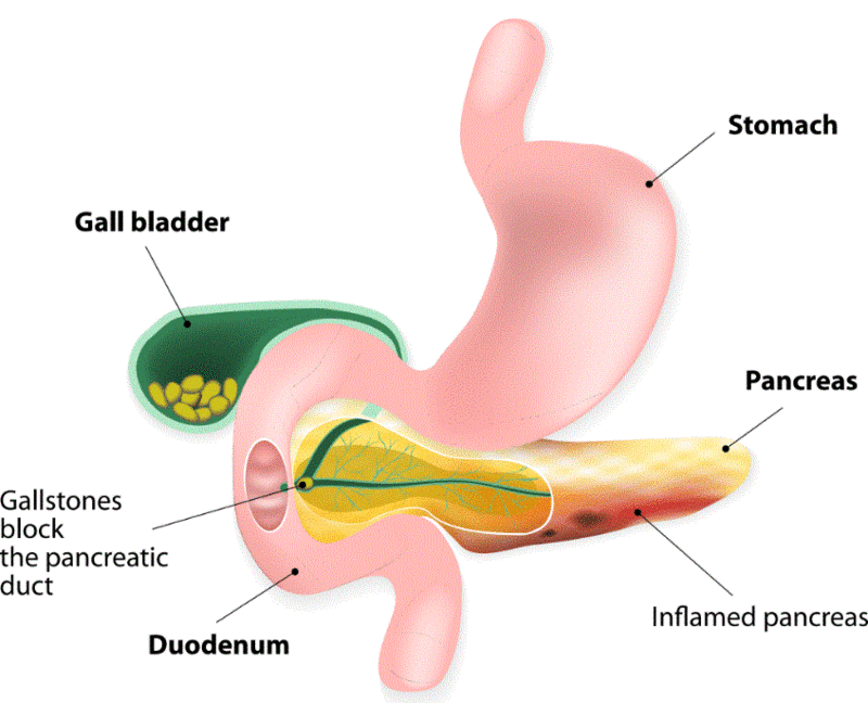PANCREATITIS is an inflammation of the pancreas. It can be acute or chronic and is caused primarily by gallstones or heavy alcohol use. Also, malignancy can obstruct the pancreatic duct resulting in severe, sudden pain. Abdominal pain associated with pancreatitis is primarily