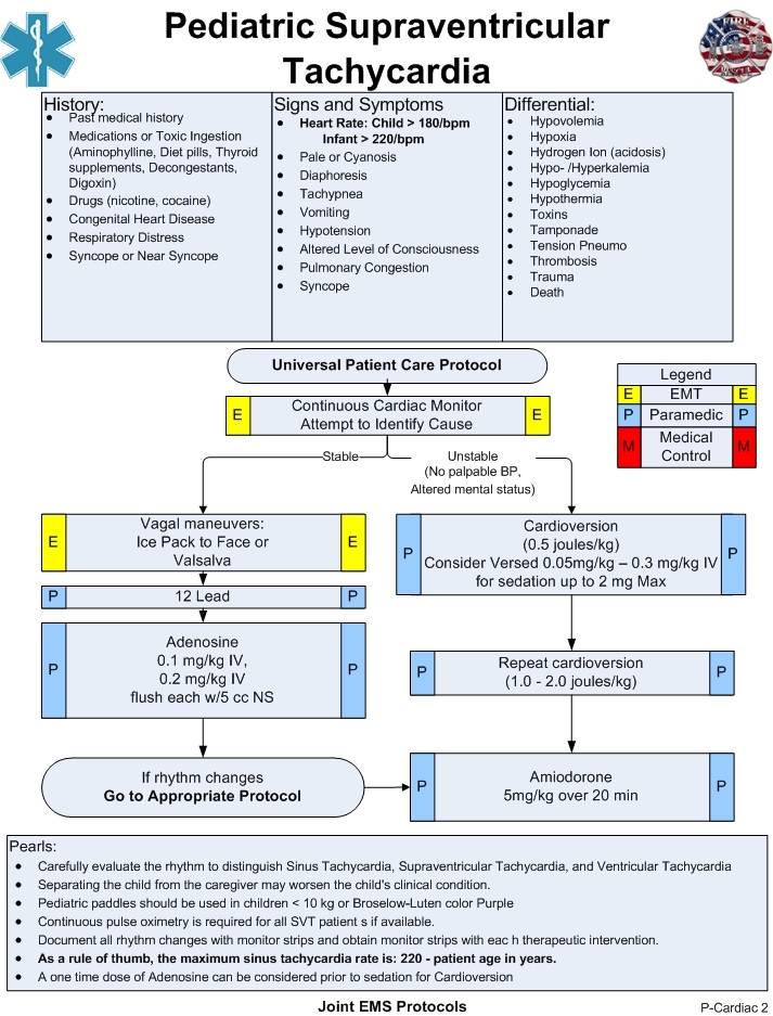 Supraventricular tachycardia (SVT) is a common non-arrest dysrhythmia seen in children, especially during infancy, and is the main cause of cardiac-related instability. Most infants with SVT will outgrow the syndrome without lasting effects. History of the complaint is the key to proper distinction between SVT and rapid sinus tachycardia. The onset of SVT will usually show up in a normal child that is suddenly deteriorating with no history of a recent illness or injury. However, it must be carefully evaluated to ensure that proper treatment is implemented.